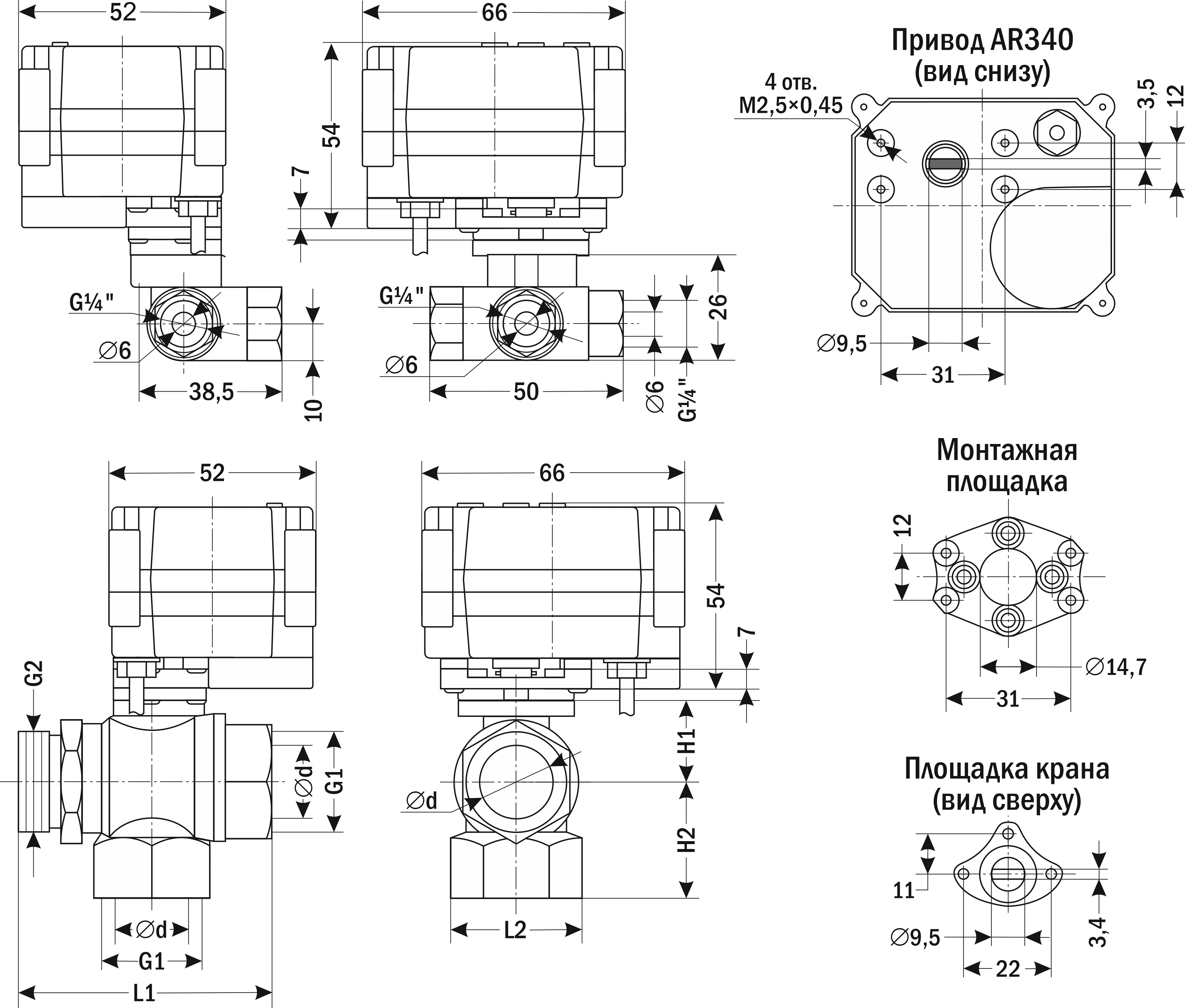 Привод AR340 прикручивается к монтажной площадке кранов AR340-3 четырьмя винтами М2,5×0,45, L=14 мм.